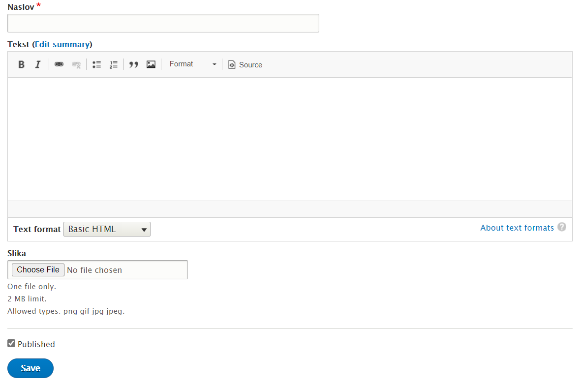 Otvara se obrazac za unos detalja novosti: naslov, tekst novosti, slike, alternativni tekst slike. Označite je li novost objavljena klikom na "Published" (Objavljeno).
