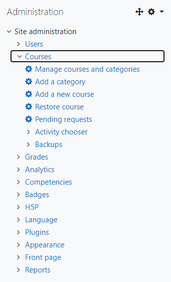 Novi tečaj kreira se odabirom opcije s lijeve strane ekrana "Site administration" > "Courses" > "Add a new course".