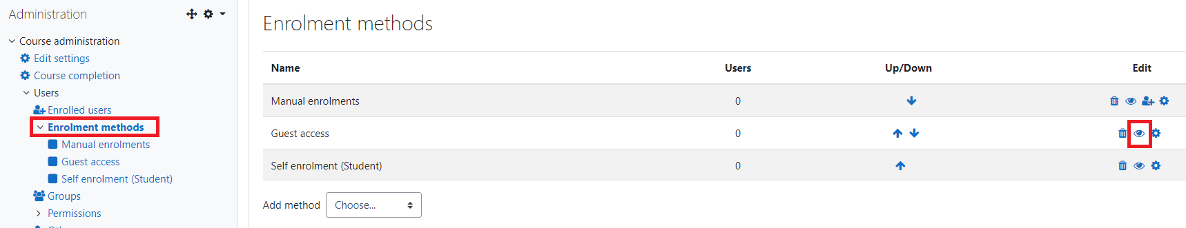 Tko može vidjeti tečaj postavlja se odabirom opcije "Users" > "Enrolment methods" s lijeve strane. Ukoliko želite da svi mogu pristupiti tečaju, kliknite na crveno označenu ikonu oka.